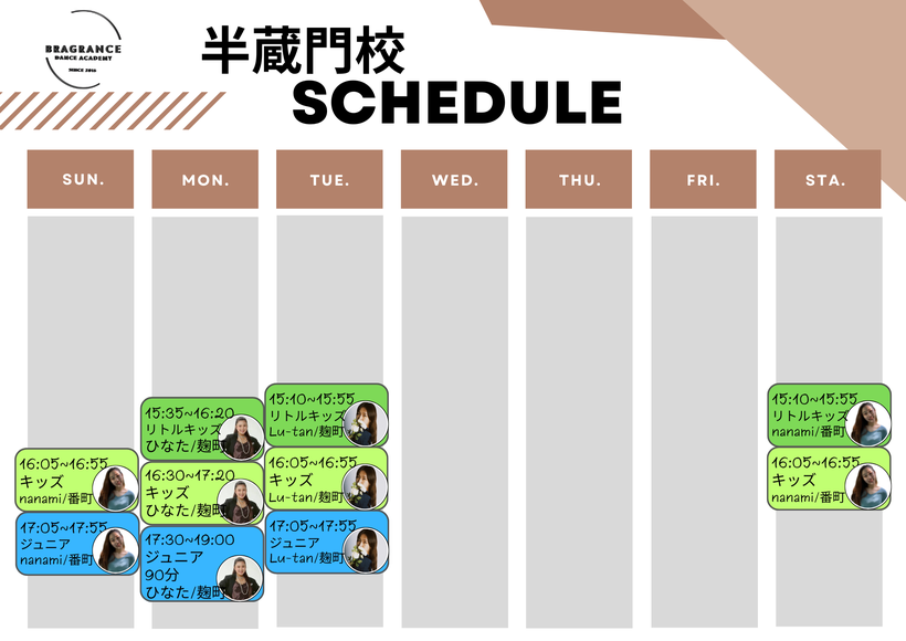 例)火曜日リトルキッズクラスの方がレッスンをお休みされた場合、金・土・日曜日リトルキッズクラスへの振替が可能です。